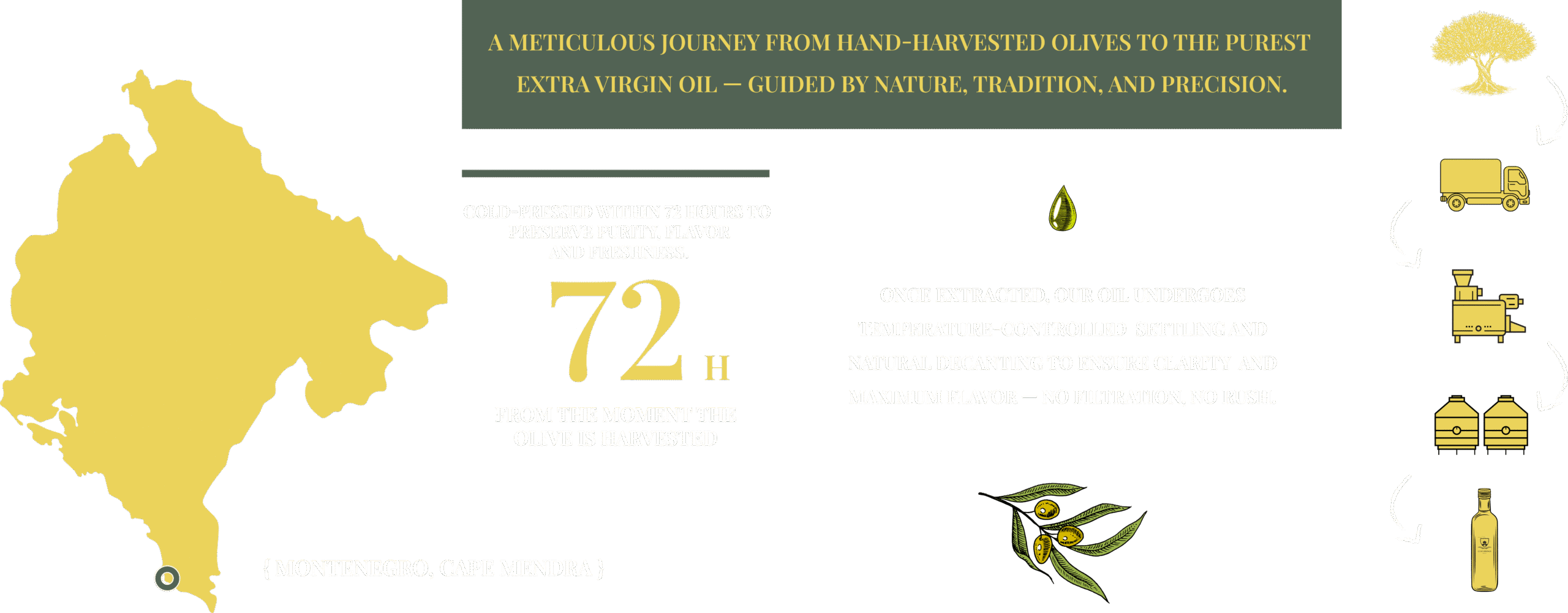 Crafted from hand-harvested olives grown on sun-kissed coastal groves in Cape Mendra, our extra virgin olive oil captures the very soul of Montenegro’s natural richness. With every drop, you experience a balance of bold flavor and smooth texture — a tribute to the untouched beauty of Valdanos Bay.